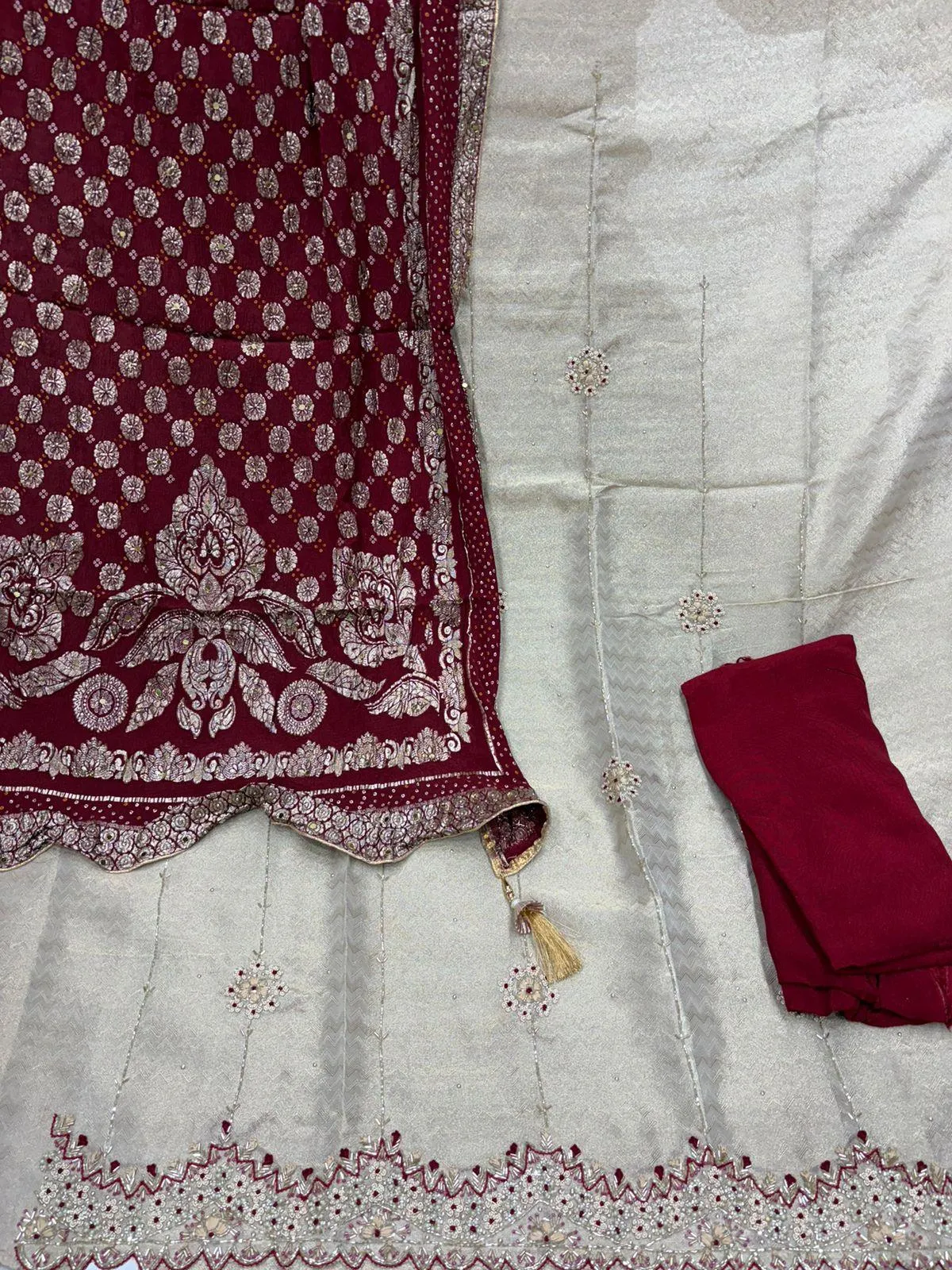 This elegant Jaipuri partywear suit features exquisite handwork detailing that adds a rich and graceful appeal. Paired with a heavy Bandhani dupatta, it creates a stunning traditional look, making it a perfect choice for parties, festive occasions, and special celebrations.